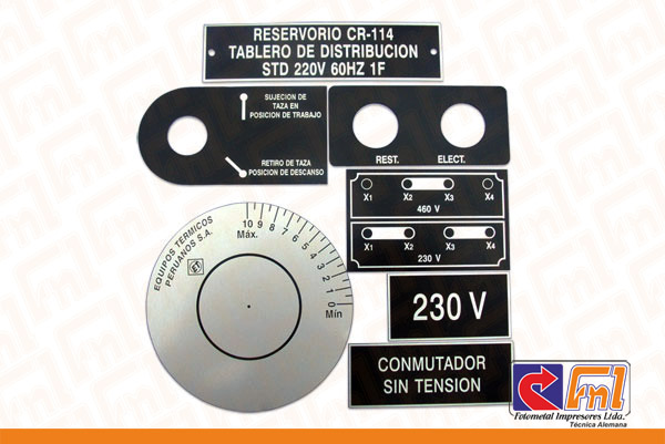 Placas en acero inoxidable grabadas en bajo y alto relieve, tamaño y características según requerimientos del cliente, para tanques de almacenamiento.
